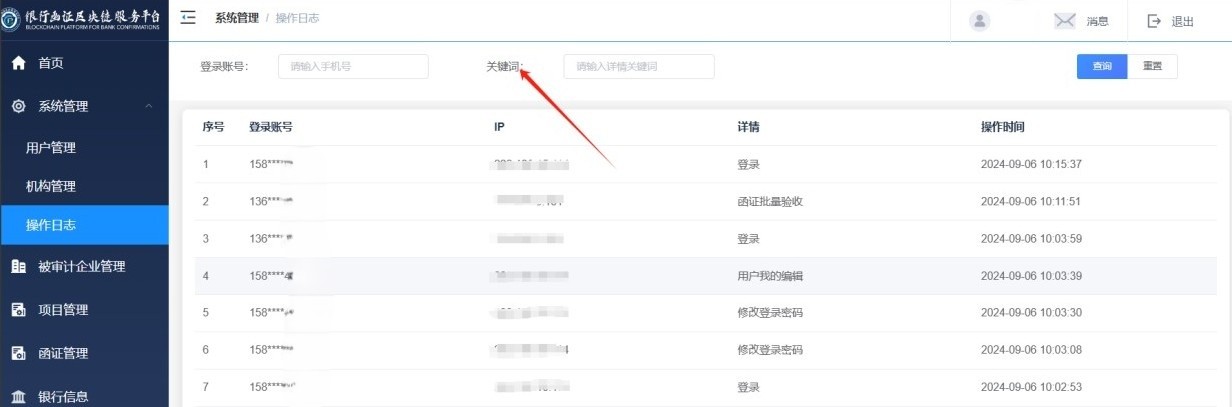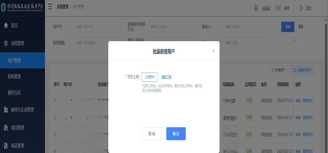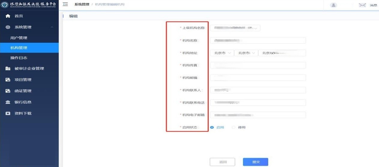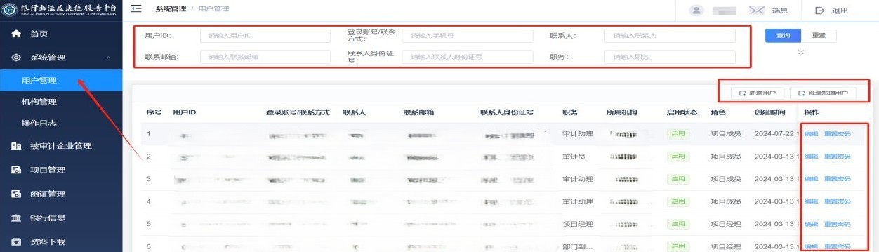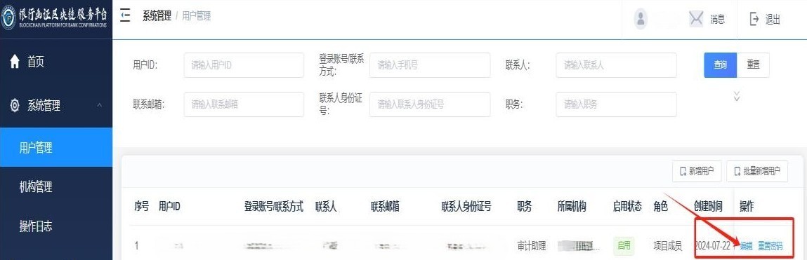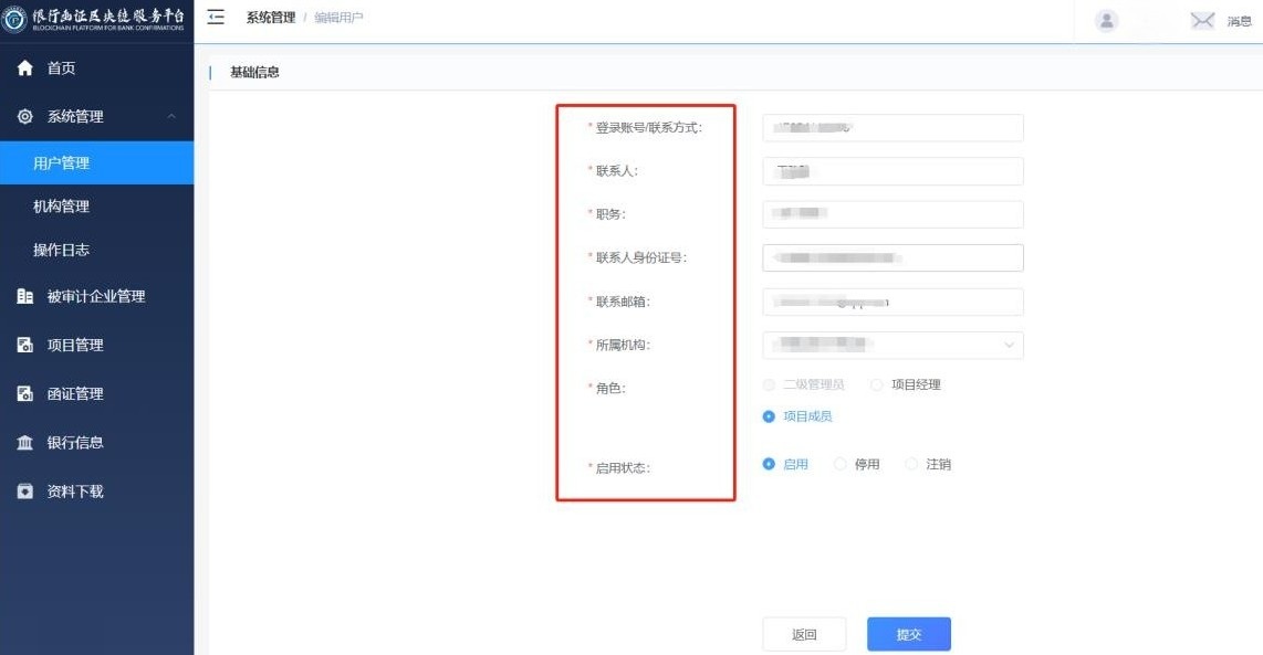 “启用状态”说明:当用户“启用状态”设置为“启用”时,可正常登录“银行函证区块链服务平台”;当用户“启用状态”设置为“停用”时,用户需要联系系统管理员恢复为启用状态后,才能正常登录系统;若系统管理员将用户“启用状态”设置为“注销”,则该用户不可登录“银行函证区块链服务平台”,且不可恢复。