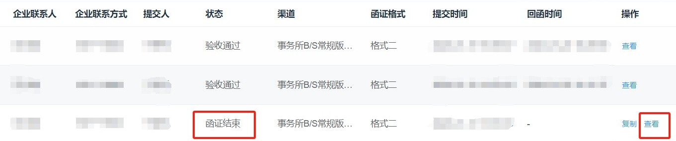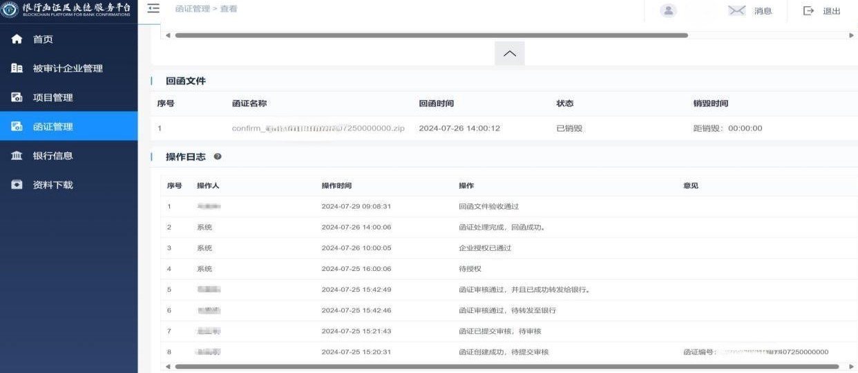 答:回函成功或者回函失败均表示函证结束。如回函成功,需由项目中验收人员验收并下载回函文件;如回函失败,可在“操作”处点击“查看”,查看“操作日志”,查询具体失败的原因,将此份询证函的反馈信息对照《银行业务规则》进行检查,无误后再次提交函证,重新发函。(见图65、图66)。