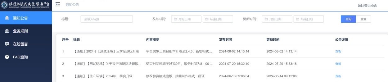 此页面包括通知通告、业务规则、在线留言和FAQ查询四个栏目。