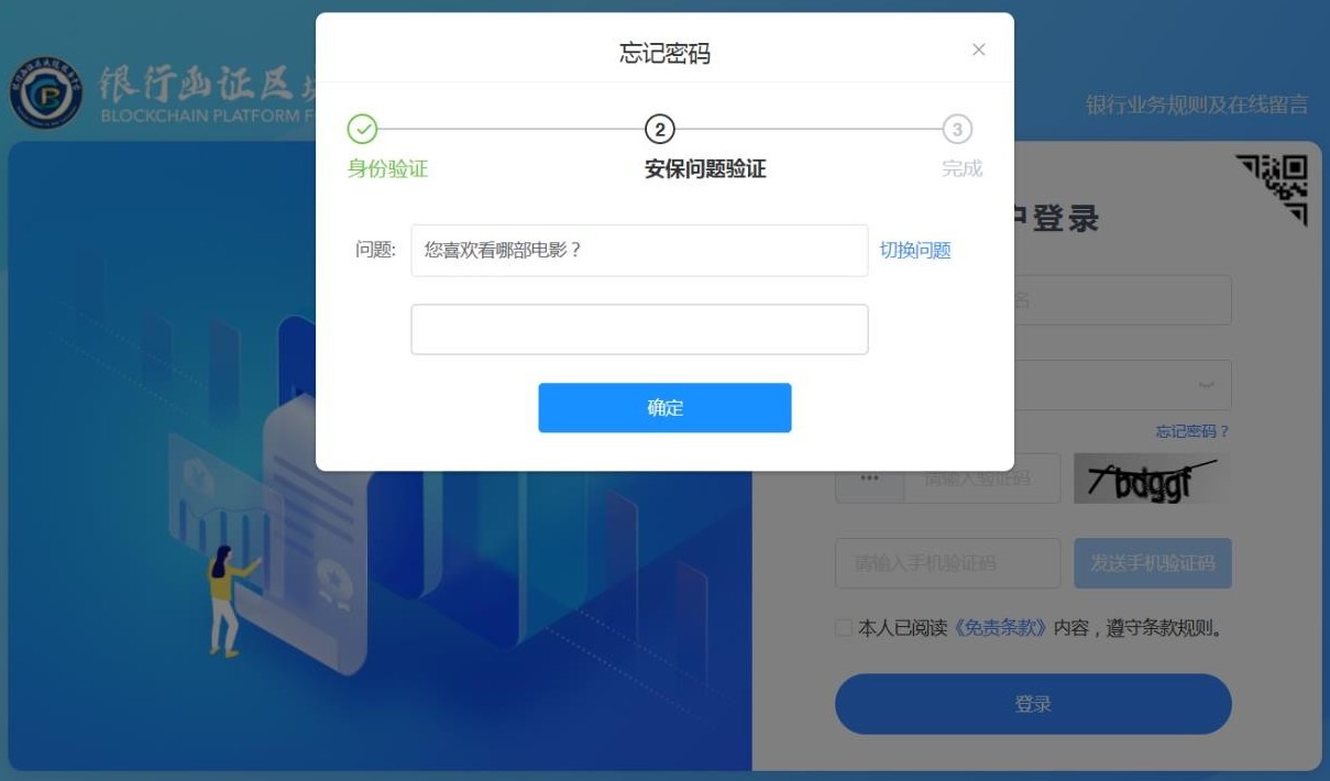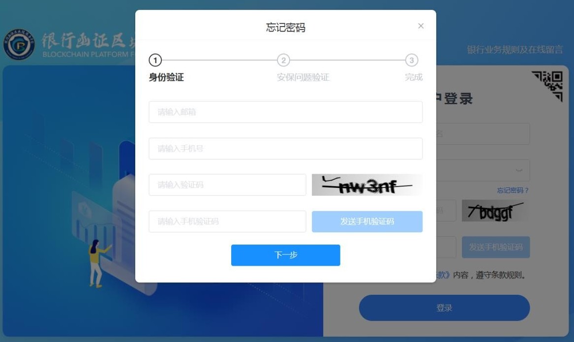 在忘记密码界面,用户首先需要先进行身份验证(见图5),用户正确输入邮箱、验证码和短信验证码进行校验,校验通过后,点击“下一步”按钮,进入安保问题验证界面。