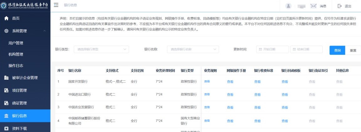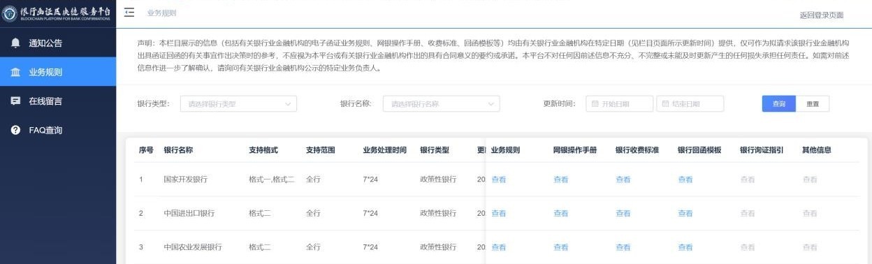 在此栏目页面可查询平台上线银行名单、上线银行的业务规则、网银操作手册、银行的收费标准、银行的回函模板等信息(见图10)。