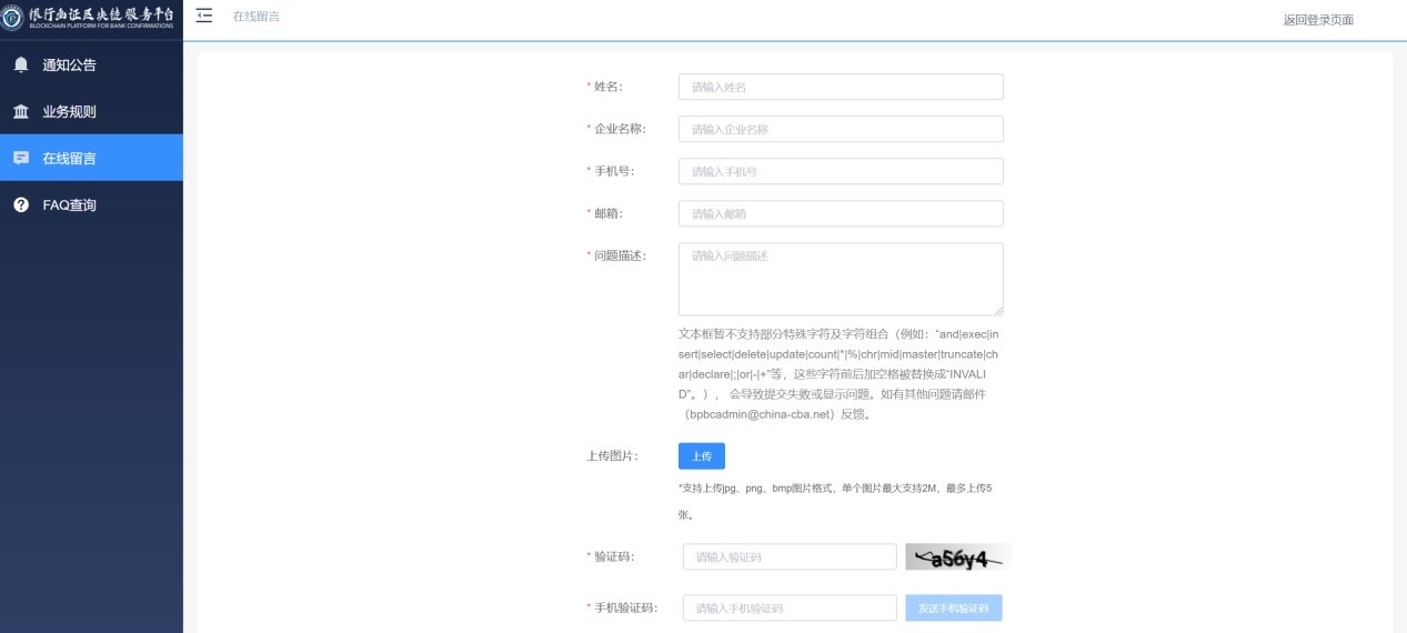 用户点击登录页面的银行业务规则及在线留言按钮,即可跳转至银行业务规则及在线留言信息页面(见图8)。