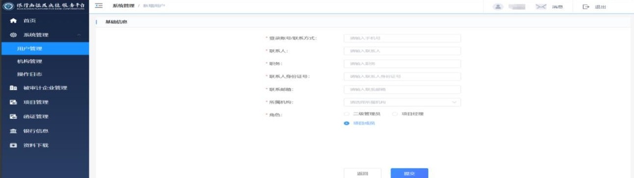 在该界面可为本机构或子机构新增不同角色的用户,设置二级管理员、项目经理及项目成员。新增成功后,系统会将新增用户的登录账号和密码以邮件方式发送至用户的联系邮箱内。