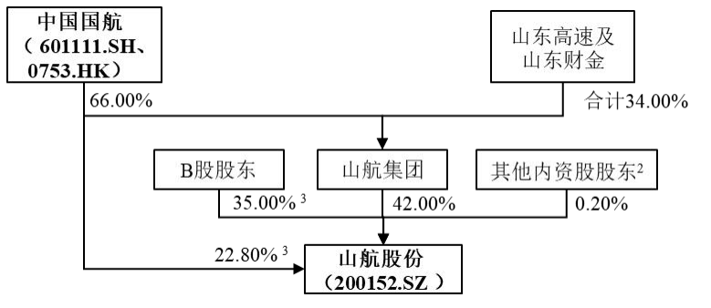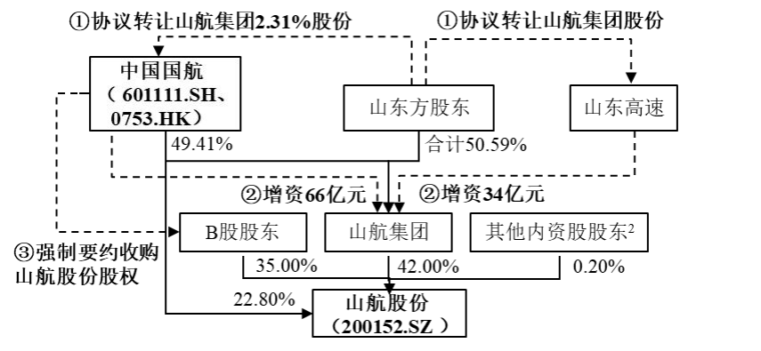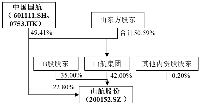 上图①协议转让和②增资已完成的情况下,中国国航对山航B发起强制要约收购。根据山航B公告,截至2023年4月21日,本次要约收购期限届满。要约期内共计5,832股上市流通股份(B股)接受中国国航发出的要约,占山航B总股本的0.001458%。前述两步交易完成后的股权结构图: