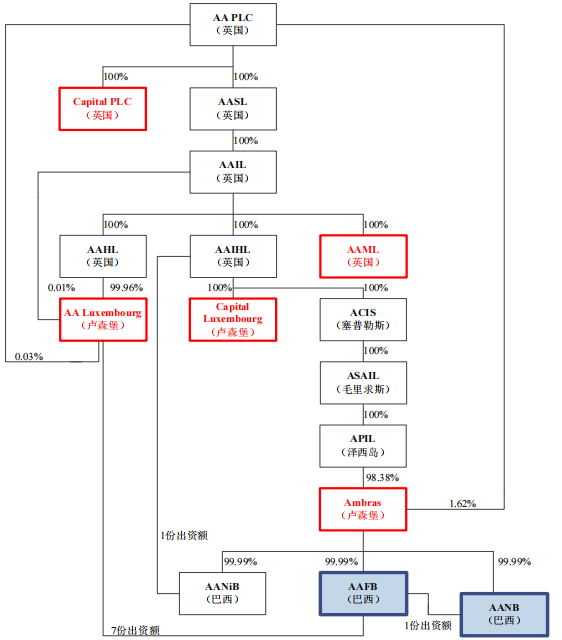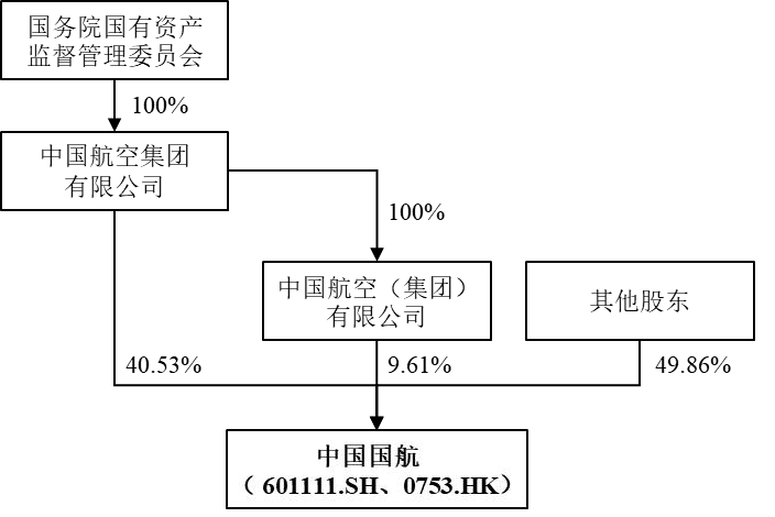 中国国航于2022年5月30日(即山航B首次发布关于筹划控制权变更暨停牌的公告前一日)收盘时的市值为1,191.51亿元。第一步控制权收购交易前,中国国航股权结构如下图所示: