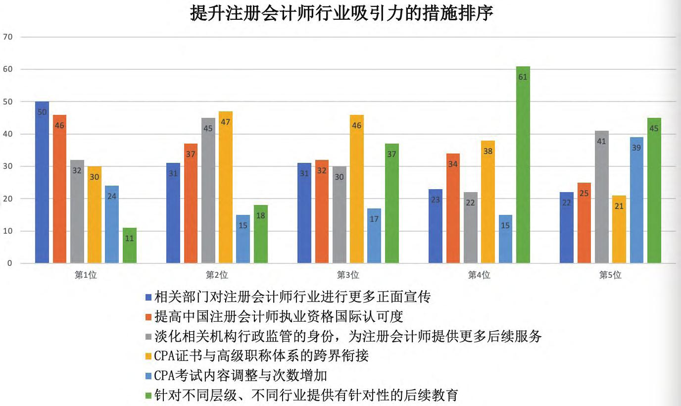其次,受访者认为我国注册会计师行业对人才的吸引力优势下降还存在国际化程度不足的原因。有合伙人指出:“在较为发达的国家,其会计行业国际化,主要是‘人’走出去,即注册会计师职业资格在国际上得到其他国家认可。”因此,推动中国注册会计师职业资格的国际认证,实现与其他注会执业资格的互认及豁免,既提升中国会计行业的国际化程度,也能增加注册会计师称号的含金量,从而进一步为行业吸引人才。同时,受访者也期待行业主管部门可以联合各相关部委,考虑将注册会计师资格(CPA证书)与高级职称体系进行跨界衔接,进一步提升注册会计师的社会地位和认可度。