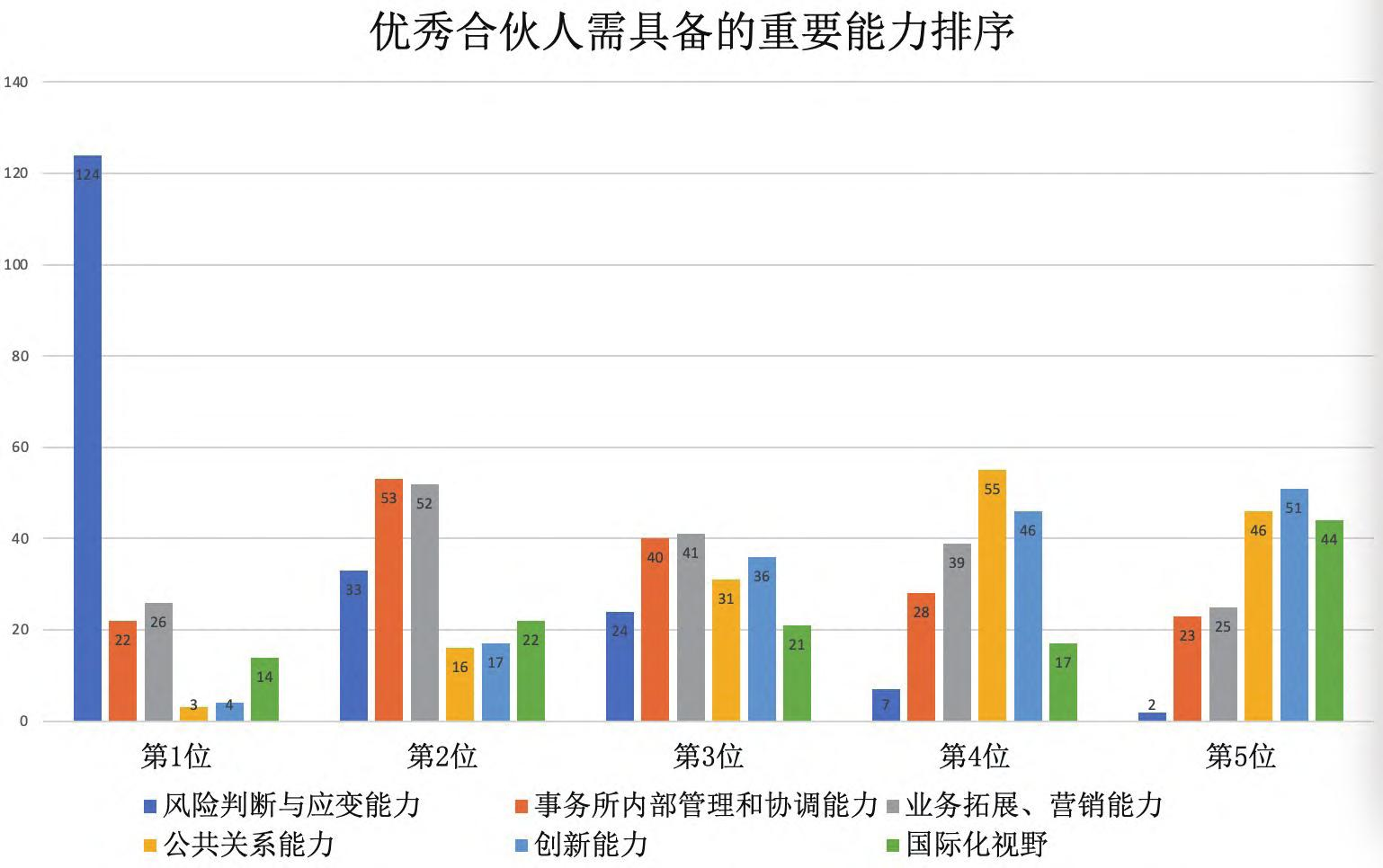 与此同时,随着新《证券法》逐步落实,压实资本市场中介机构“看门人”责任的信号也在不断释放。作为事务所向导的合伙人如何在与日俱增的行业风险与日新月异的行业变革中看清形势,并找到应对之策越来越重要。一位受访的高级合伙人表示:“注册会计师行业确实是一个高风险行业,从三十年前到现在,经济活动的形式和方式发生了很大改变,出现了越来越多的新交易模式,对审计师提出要求也越来越高。审计师应该利用平台的学习机会,集合各合伙人的不同专业所长来规避这些风险,严守职业操守。在高危行业从事高风险工作,审计师就应该不断‘强身健体’、提高抵抗风险的能力。”如图5所示,在193份匿名问卷中,有124位受访者将风险判断与应变列为当下优秀合伙人需具备能力的首位,远超事务所内部管理协调(22份)能力以及业务拓展营销能力(26份)。