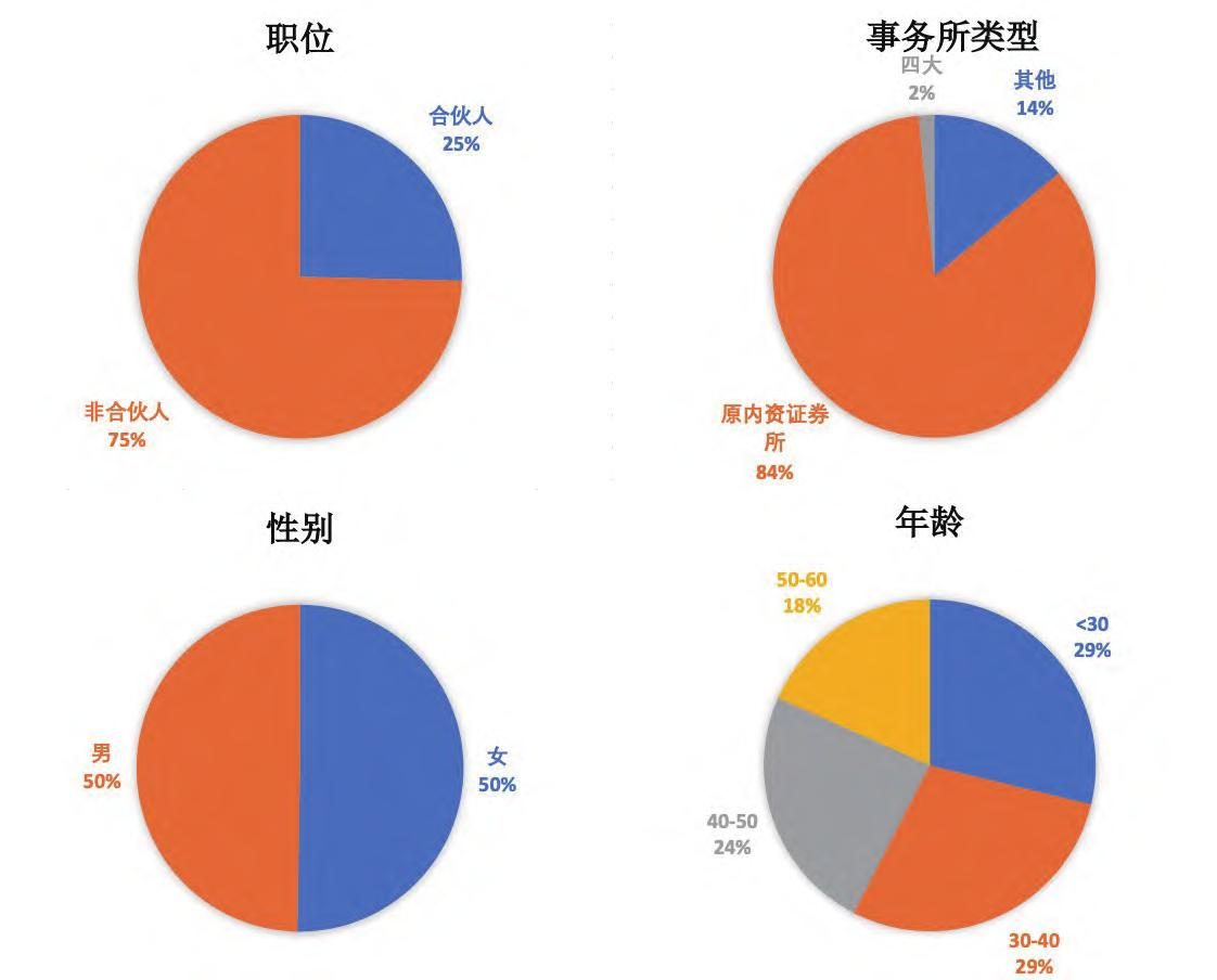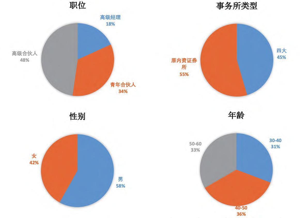 围绕注册会计师行业人才培养全生命周期的四个关键阶段,并综合考虑行业人才培养各个环节的工作与制度,课题组按照行业进入、职业发展与瓶颈、事务所管理与领导、其他四个大类问题设计了半结构化访谈。在尽可能降低选择偏误的前提下,课题组分别面向高级经理(含近一年内晋升的青年合伙人)和高级合伙人提供了两份访谈提纲,最终采访了目前在会计师事务所执业的44名4行业代表人士,受访者基本信息如图1所示。
