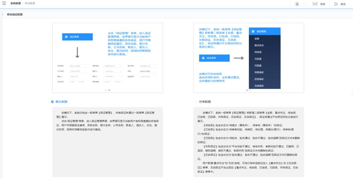 在“配置管理”菜单中,点击“函证配置”对应行右侧的“编辑”按钮,即可进入“修改函证配置”界面(见图17)。在该界面中,用户可选择符合本企业需求的配置并保存。
