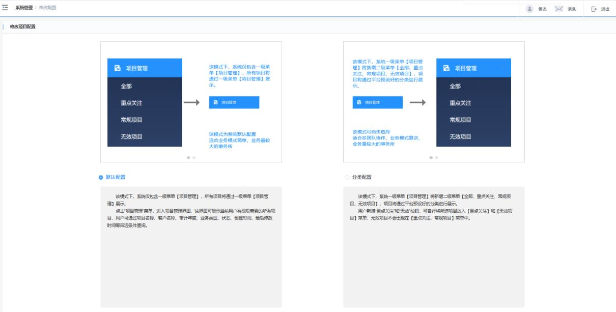 在“配置管理”菜单中,点击“项目配置”对应行右侧的“编辑”按钮,即可进入“修改项目配置”界面(见图18)。在该界面中,用户可选择符合本企业需求的配置并保存。