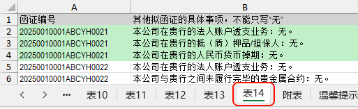 - 若需函证第14项内容,应当写明具体项目;若需函证第14项内容没有相关交易或余额,应先写明具体项目后再注明“无”(例如:“本公司与贵行之间未履行完毕的贵金属合约:无。”);如果仅简单填写“无”而未列明具体项目,银行业金融机构可能不予接受。