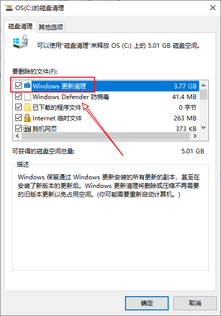 按需勾选拟删除的文件(如: Windows 更新清理 等,可以全选) → 确定。