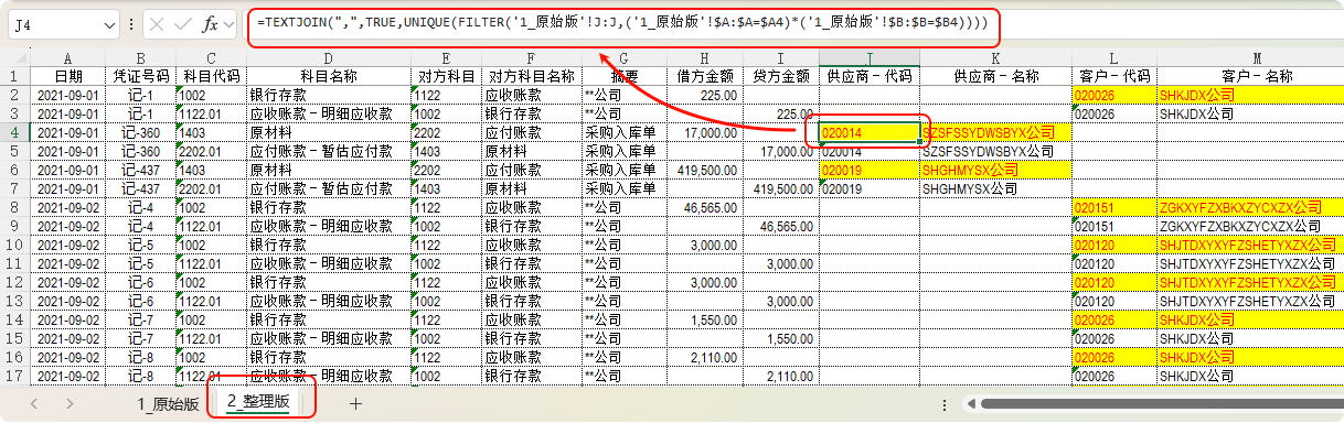 =TEXTJOIN(",",TRUE,UNIQUE(FILTER('1_原始版'!J:J,('1_原始版'!$A:$A=$A2)*('1_原始版'!$B:$B=$B2))))