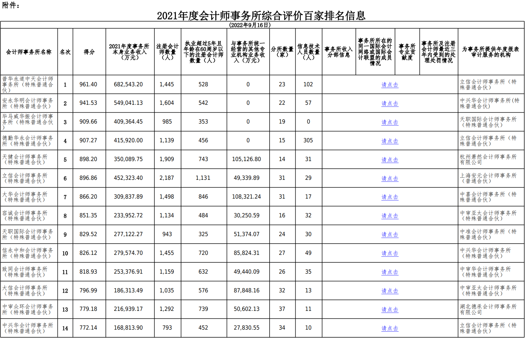 中注协于2022年9月20日发布了《2021年度会计师事务所综合评价百家排名信息》。
