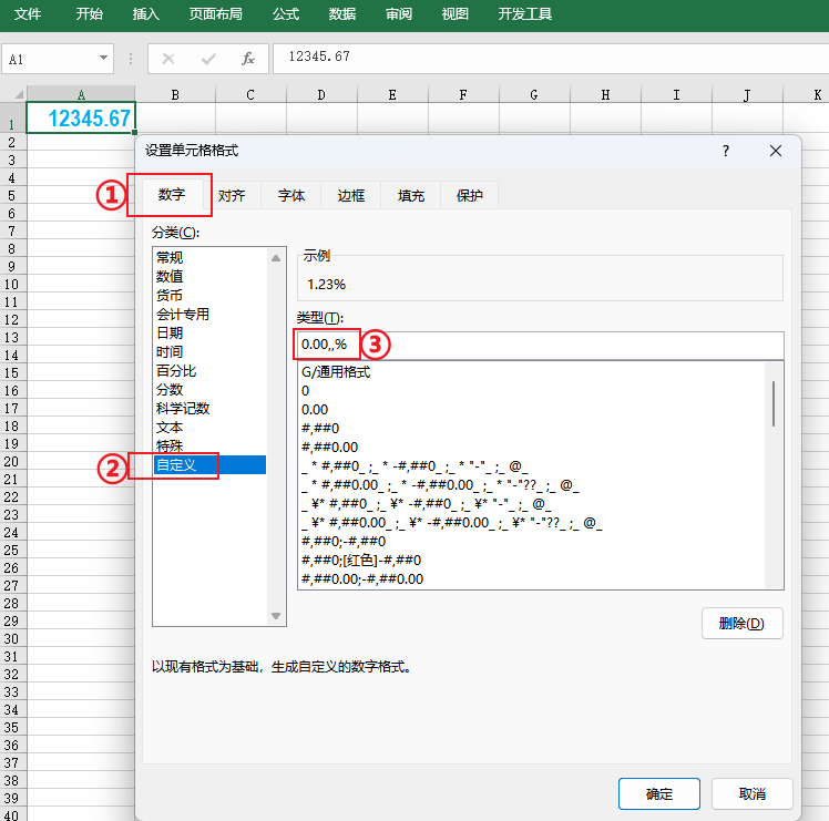 选中所需设置自定义格式的数字单元格区域,按快捷键(Ctrl + 1),或者单击右键 → 设置单元格格式 → 数字 → 自定义 → 输入或复制粘贴如下自定义格式: