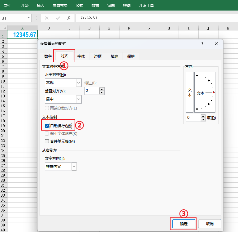 …… → 对齐 → 勾选“自动换行” → 确定 。