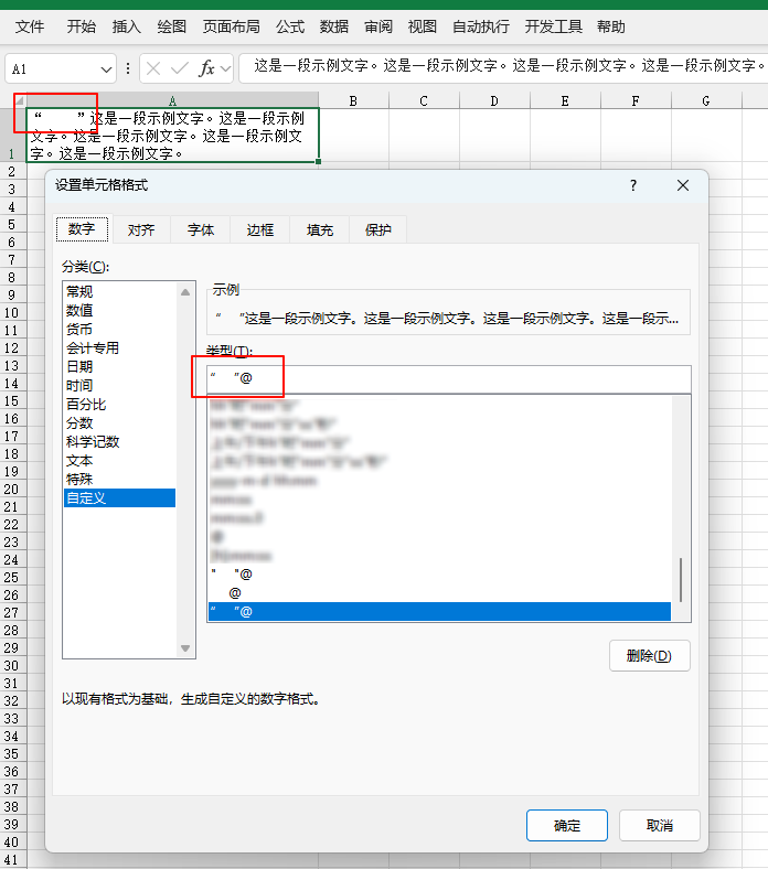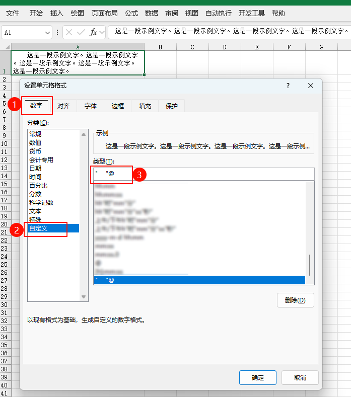 Excel 设置单元格格式 → 数字 → 自定义 → 输入" "@ → ……