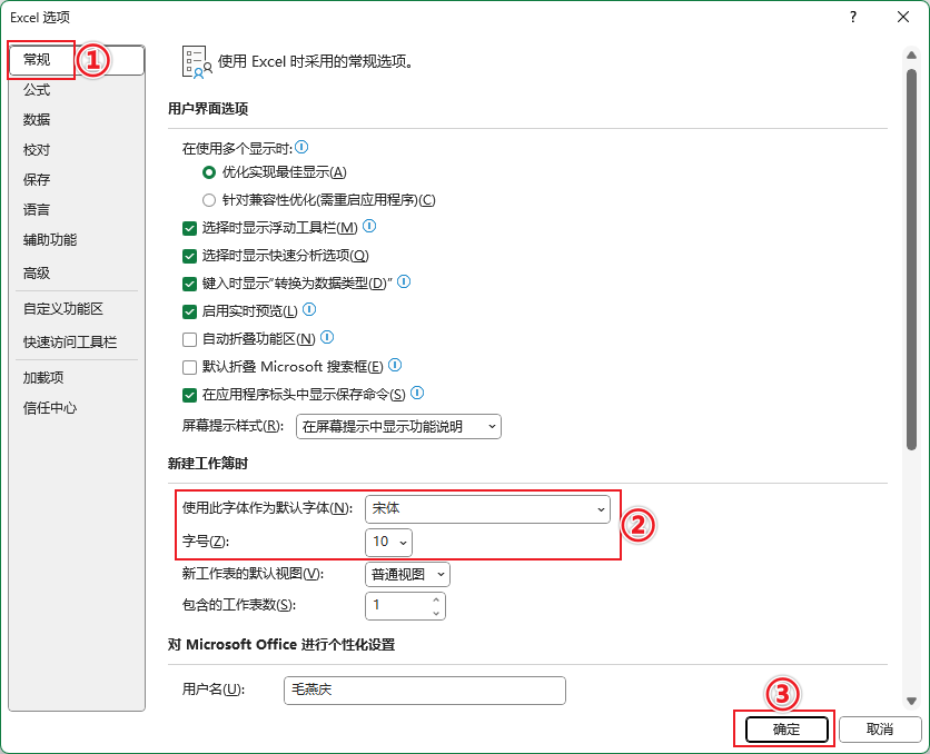 Excel 更改默认字体和字号 2023-12-14 21:30 | 1,402 | 2 | Microsoft Excel 51 字 | 几秒读完 操作路径:Excel → 文件 → 选项 → 常规 → 新建工作簿时 → …… 使用此字体作为默认字体:(按需下拉选择) 字号:(按需下拉选择) 赞赏