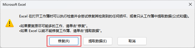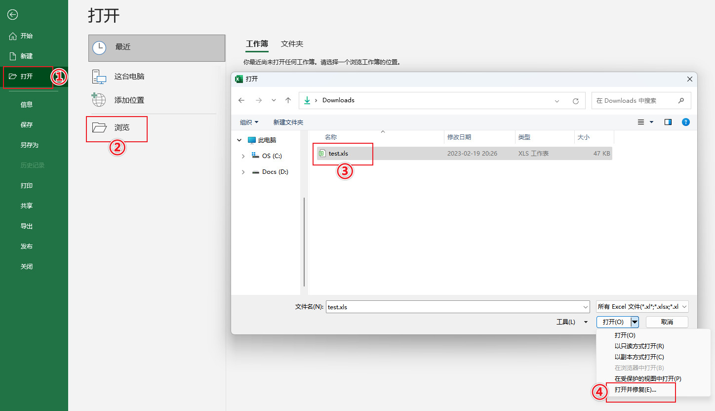 Excel → 文件 → 打开 → 浏览 → 选择所需修复的文件 → 下拉选择 打开并修复 。
