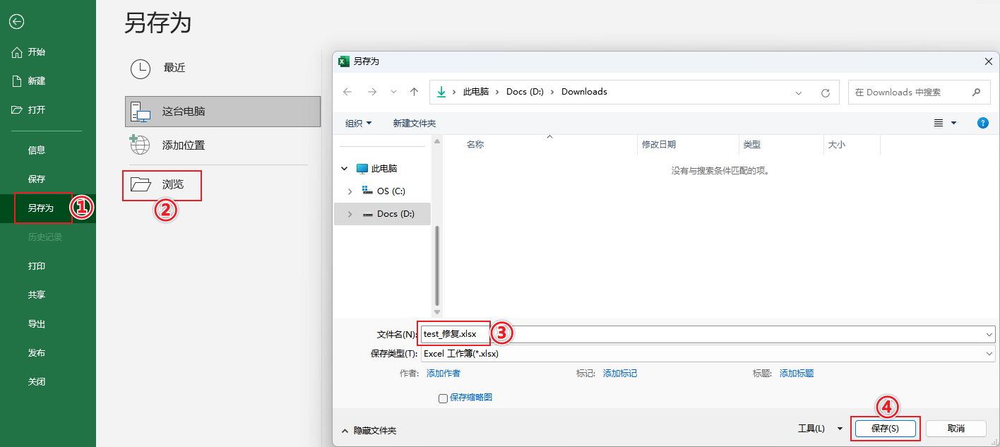 Excel → 文件 → 另存为 → 浏览 → 选择所保存的路径 → 重命名一下修复后的文件名(如:加个后缀 _修复 以示区分) → 保存 。