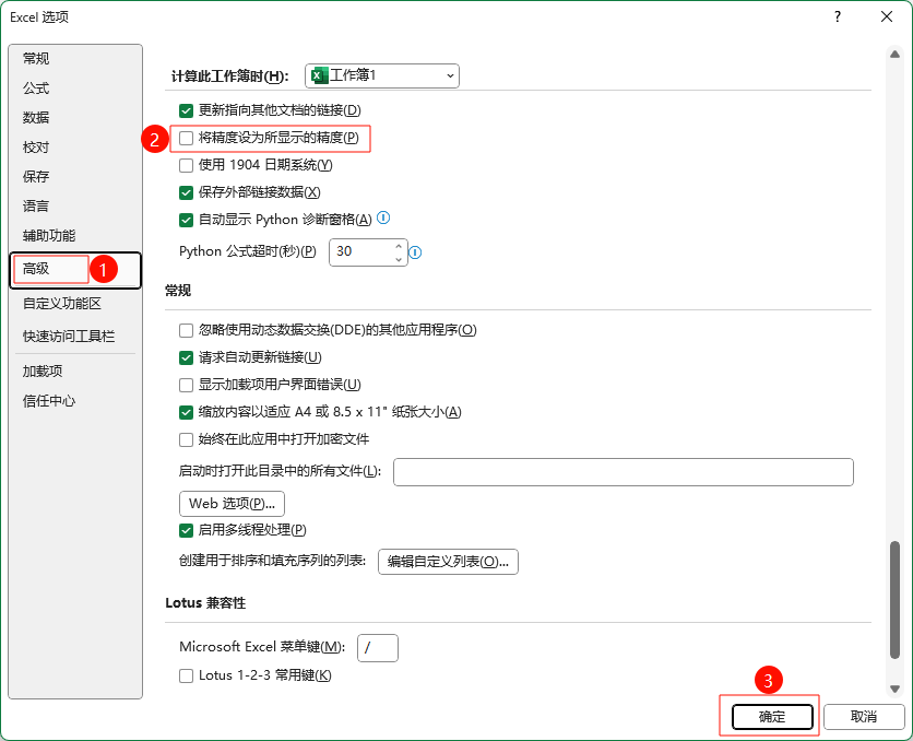 Excel 计算此工作簿时——将精度设为所显示的精度 2024-2-27 16:31 | 1,449 | 0 | Microsoft Excel 39 字 | 几秒读完 1. 操作路径 Excel → 文件 → 选项 → 高级 → 勾选或取消勾选“将精度设为所显示的精度” → 确定。 赞赏