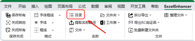 【ExcelEnhancer】生成目录 2025-10-19 10:34 | 2,372 | 0 | Maosoft/ExcelEnhancer 72 字 | 几秒读完 ExcelEnhancer 1. 操作步骤 ExcelEnhancer → 目录。 2. 结果示例 经过上述步骤操作,即可在当前Excel工作簿中生成一张名称为《目录》的工作表; 其中,B列的名称,支持点击跳转,如下: 赞赏