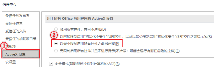 操作步骤:文件 → 选项 → 信任中心 → 信任中心设置 → ActiveX设置 → 以最小限制启用所有控件之前提示我。
