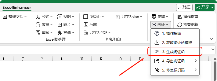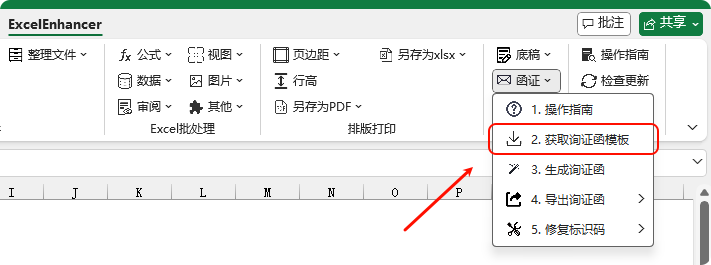 操作步骤:ExcelEnhancer → 函证… → 2.获取询证函模板 。