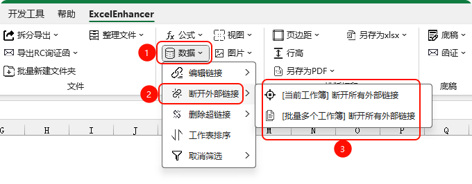 【ExcelEnhancer】批量断开外部链接 2025-10-19 10:56 | 1,097 | 0 | Maosoft/ExcelEnhancer 44 字 | 几秒读完 ExcelEnhancer 1. 操作路径 ExcelEnhancer → 数据 → 断开外部链接 → …… 当前工作簿:断开所有外部链接 批量多个工作簿:断开所有外部链接 2. 示意图 赞赏