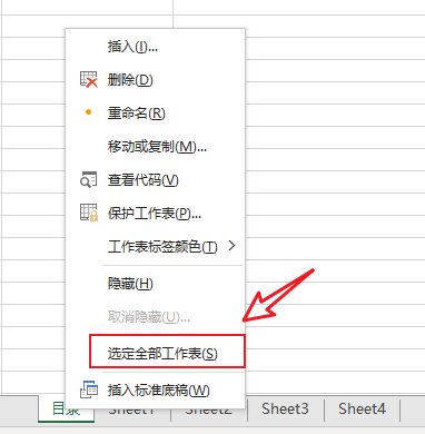 在任意工作表名上,单击右键 → 选定全部工作表 。