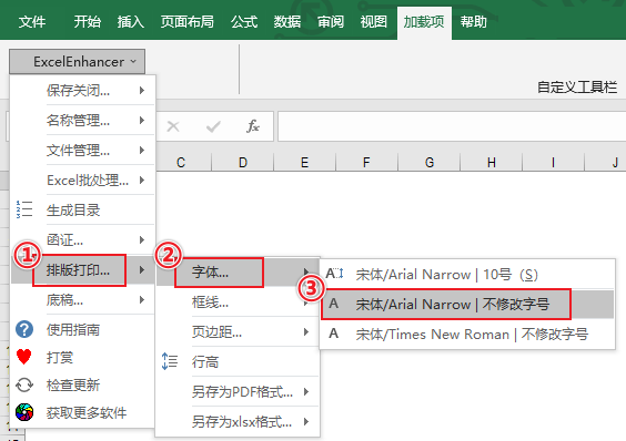 (2)ExcelEnhancer → 排版打印… → 字体… → 宋体/Arial Narrow(不修改字号) / 导出为PDF格式(*.pdf)