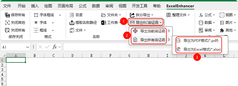 ExcelEnhancer → 导出RC询证函 → 导出当前询证函/ 导出所有询证函 → 导出为PDF格式(*.pdf) / 导出为Excel格式(*.xlsx)