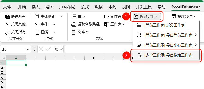 ExcelEnhancer → 拆分导出 → [多个工作簿] 导出指定工作表。