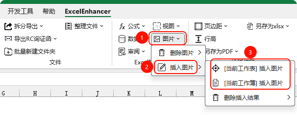 ExcelEnhancer → 图片 → 插入图片 → [当前工作表] 插入图片 / [当前工作簿] 插入图片。