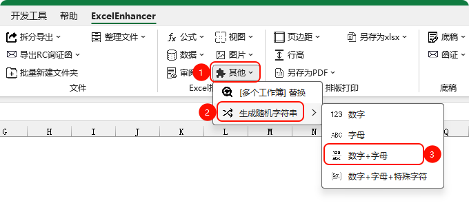 ExcelEnhancer → 其他 → 生成随机字符串 → 数字+字母。