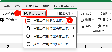 ExcelEnhancer → 拆分导出 → [当前工作表] 拆分工作表。