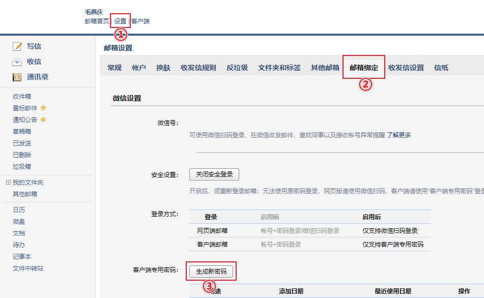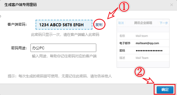 【腾讯企业邮箱】获取客户端专用密码 2023-6-07 8:41 | 4,416 | 0 | 软件教程 87 字 | 1 分钟内 1. 打开网页版腾讯企业邮箱 网址: https://exmail.qq.com/login 2. 扫码登录 打开手机微信,扫码登录。 3. 生成客户端专用密码 设置 → 邮箱绑定 → 客户端专用密码 → 【生成新密码】。 4. 复制客户端密码 复制 → 确定。 赞赏 腾讯企业邮箱