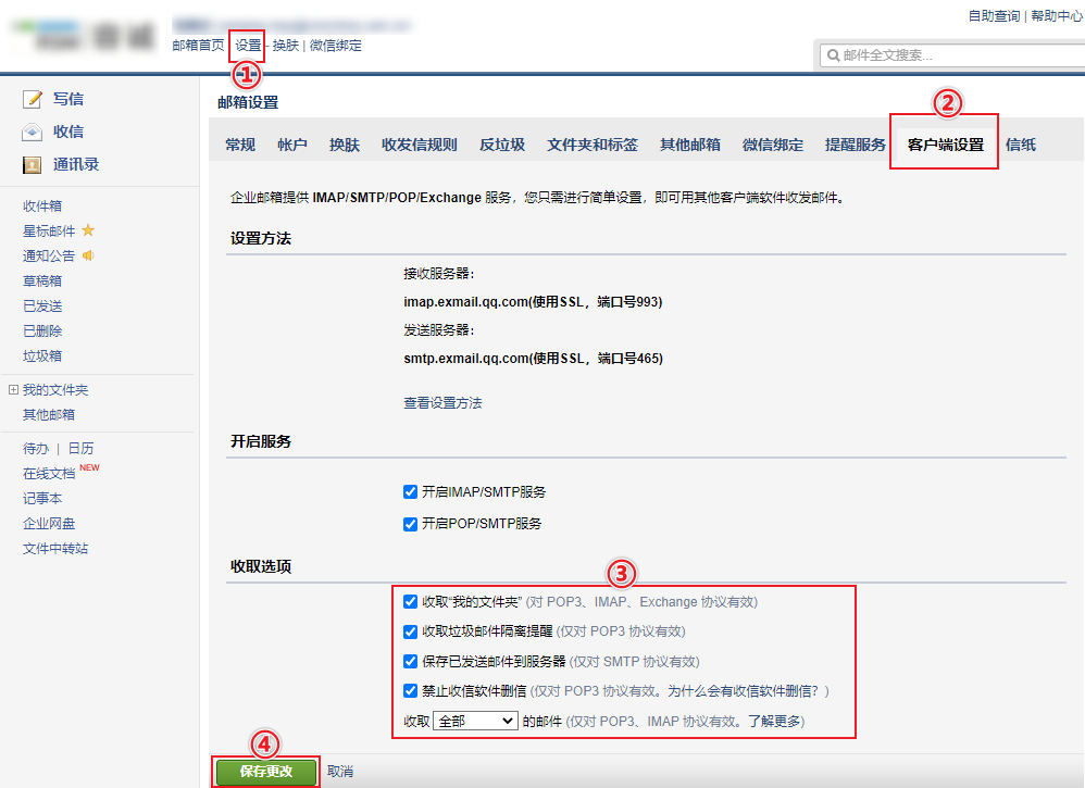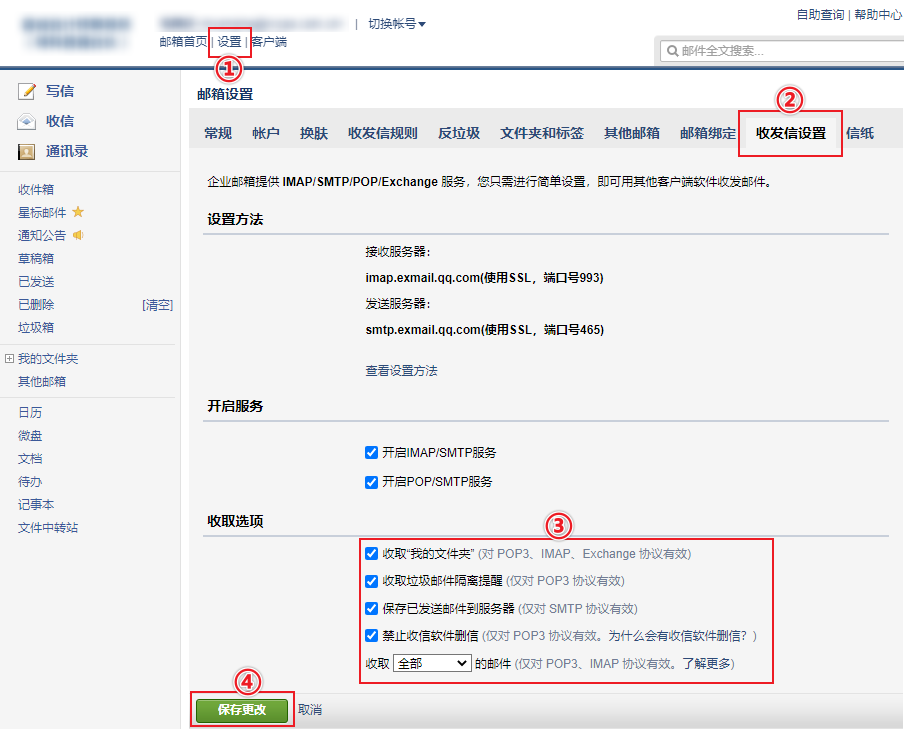 设置 → 收发信设置 → 收取选项 → (按需设置) → 保存更改。