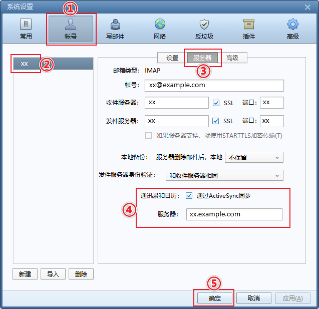 Foxmail → 设置 → 帐号管理 → 帐号 → 点击选择对应邮箱账号 → 服务器 → 通讯录和日历 → ①勾选“通过ActiveSync同步”,②填写或更新“服务器”网址。。