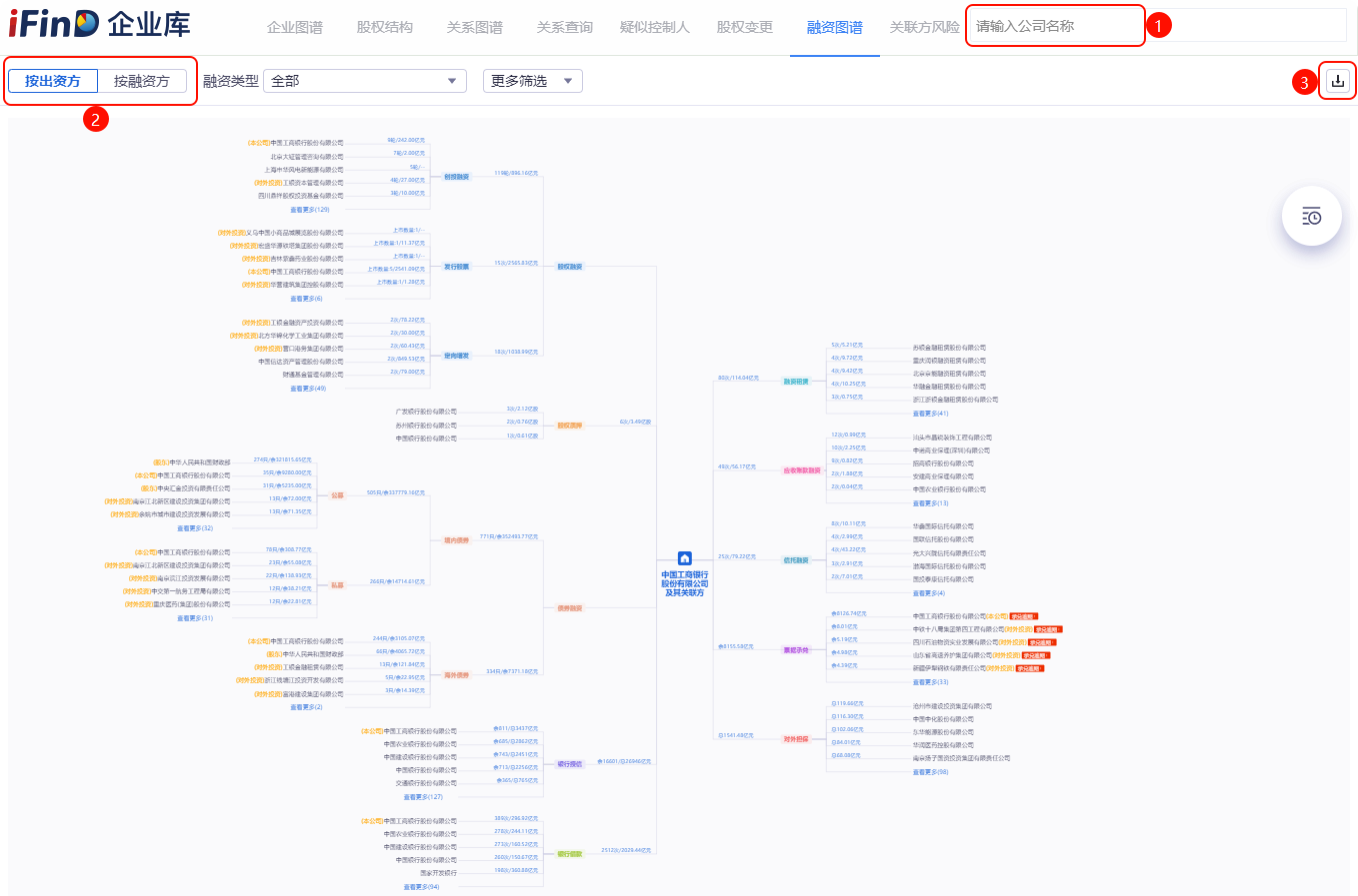 输入公司名称 → 等待出现待选列表后点击对应公司名称 → 按需选择:按出资方/按融资方 → 导出。