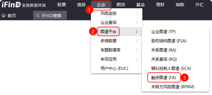 iFinD → 企业 → 图谱平台 → 融资图谱(FA)。