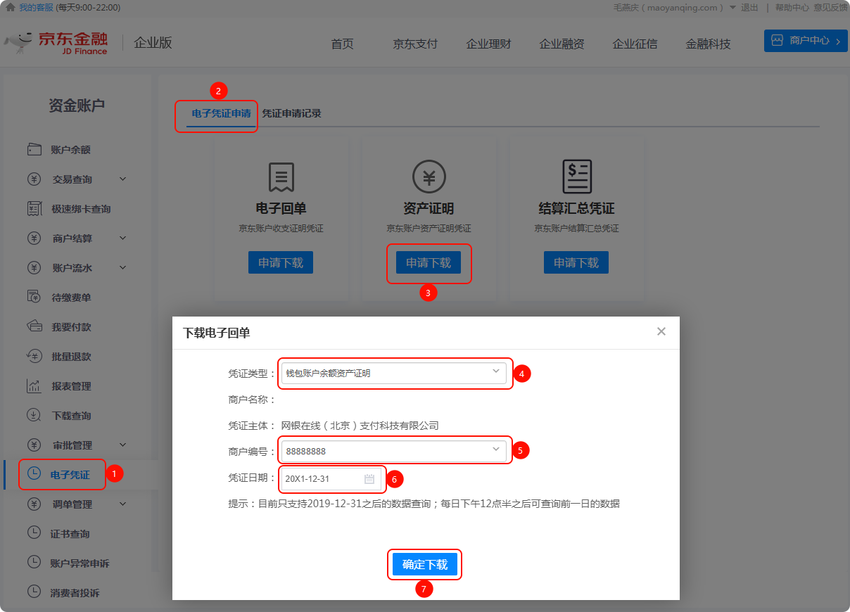 京东金融-企业版 → 商户中心 → 资金账户 → 电子凭证 → 电子凭证申请 → 资产证明 → 申请下载 → 选择“钱包账户余额证明” → 选择“商户编号” → 选择“凭证日期”(即函证基准日,如:20X1-12-31) → 确认下载。