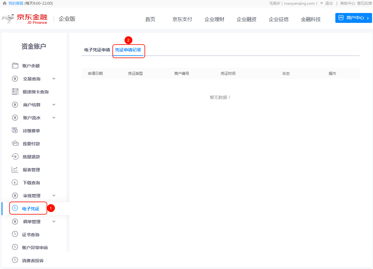 京东金融-企业版 → 资金账户 → 电子凭证 → 凭证申请记录 → ……