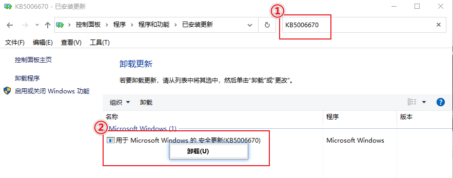 (1)复制 KB5006670 → 在右上角搜索框内粘贴 → 回车 → 在 用于 Microsoft Windows的安全更新(KB5006670)上单击右键 → 卸载(U)