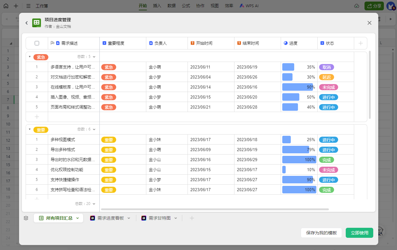 此次以《项目进度管理》模板为例,展示如下。选择好后,点击立即使用,即可应用到当前智能表格,然后就可以进行后续的编辑使用了。