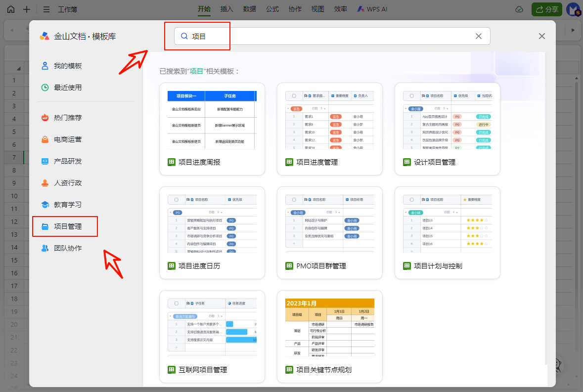 - 方法2:在顶部搜索框中输入关键词搜索,如输入关键词“项目”进行搜索。