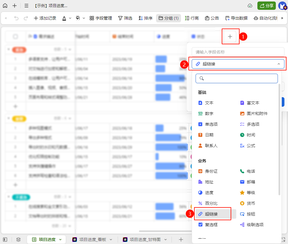 新增或修改字段属性为超链接,即可添加链接。