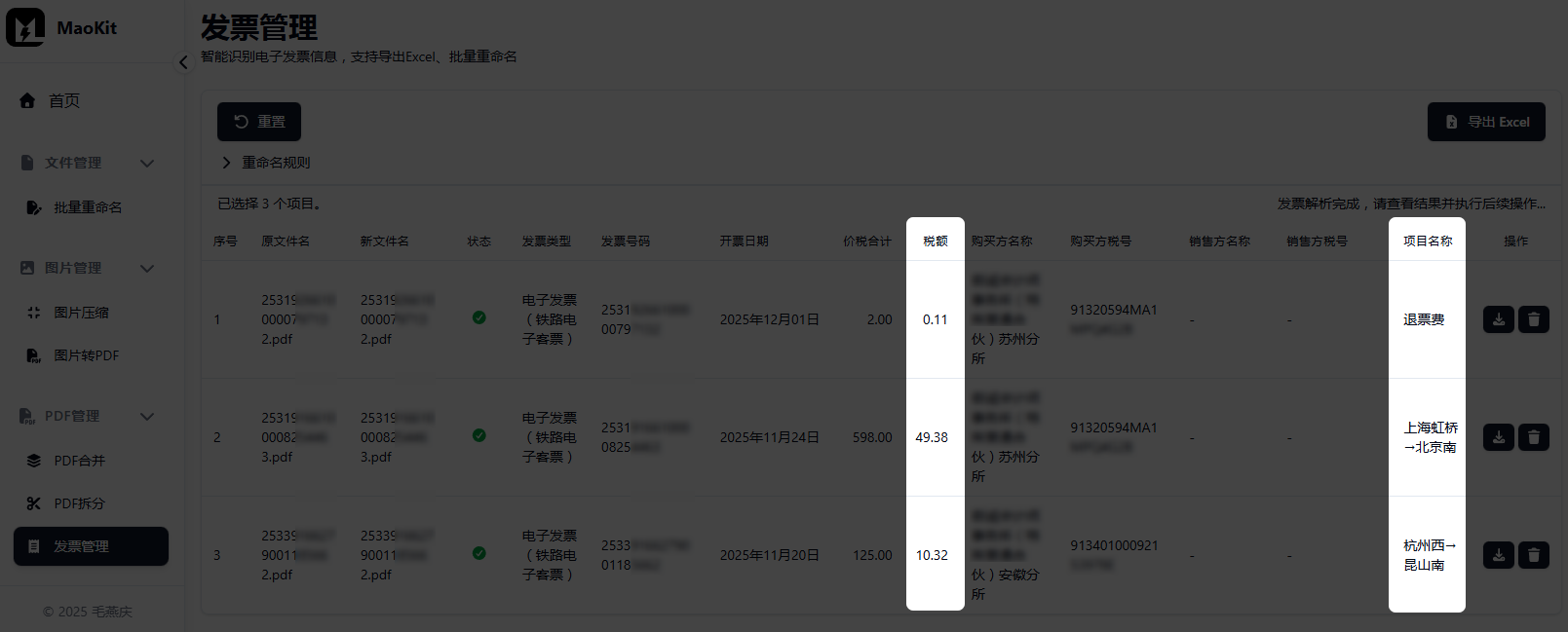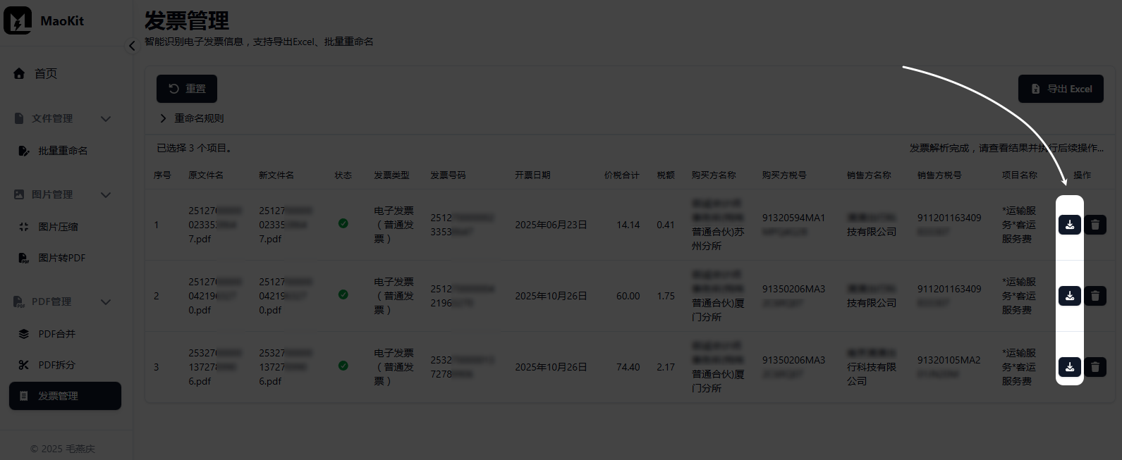本工具在解析发票信息时,会动态调用毛燕庆开发的智能解析算法,并完全在本地运行,不会将发票上传至云端。