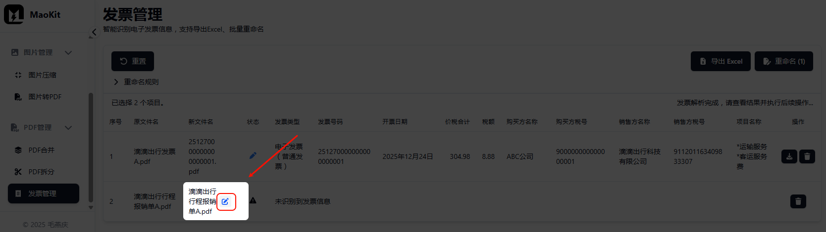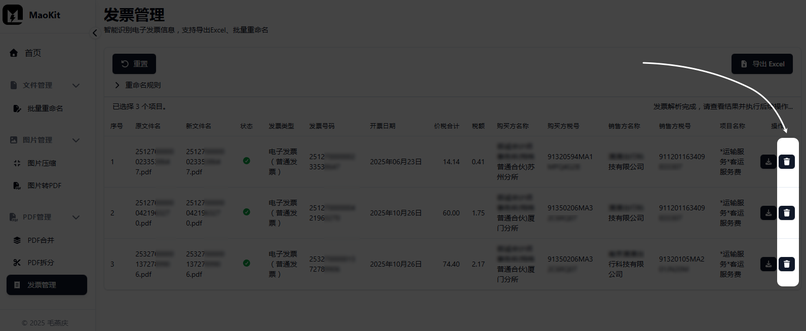 在文件列表右侧的“操作”列中,点击删除按钮,即可将不需要进行后续操作(如:重命名、导出Excel)的发票从列表中移除(此操作不会删除本地文件,仅将其从文件列表中移除)。