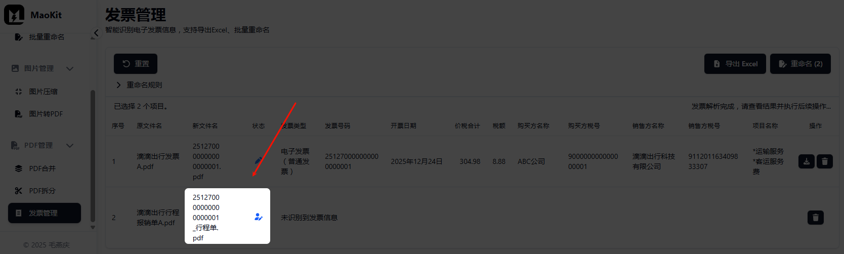默认按「发票号码」重命名,点击展开“重命名规则”设置界面可自定义。更多操作提示请参见下文“功能特性 4.1”。